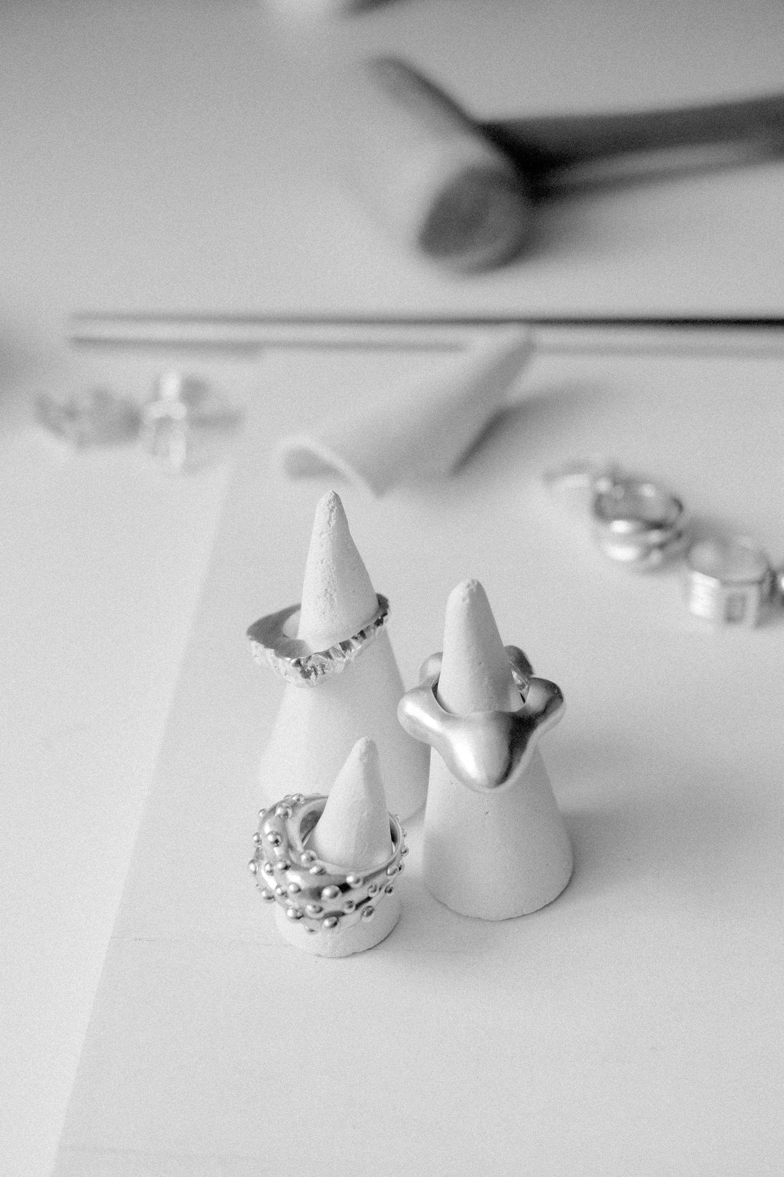 Bijoux contemporains en mouvement perpétuel, fabriqués avec de l’argent recyclé et des bijoux anciens.